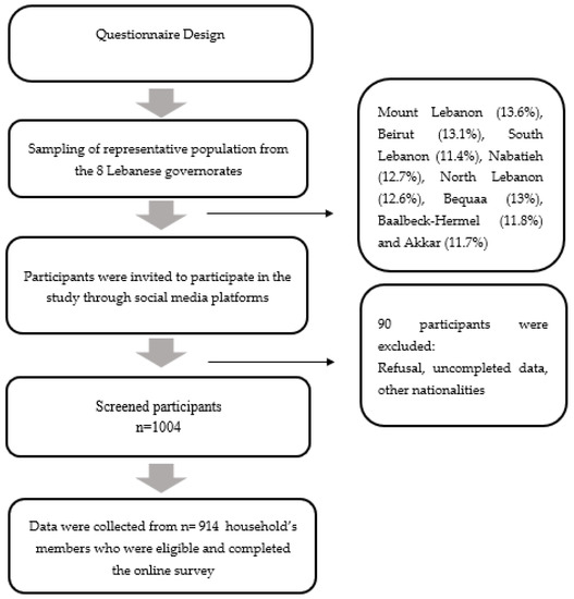 The current investigation was a national cross-sectional study conducted between June and July 2022. Study participants were sampled using the probability cluster sampling technique. Subsequently, the clusters from where participants had been recruited are the eight Lebanese governorates (Mount Lebanon, Beirut, South Lebanon, North Lebanon, Akkar, Beqaa, Baalbeck-Hermel, and Nabatieh). The heads of households were recruited from each district using a probability proportional to size sampling technique. A single population formula (n = [p (1 − p)] × /(]) was used to determine the sample size, where n denotes the sample size, Z_(∝/2) is the reliability coefficient of standard error at a 5% level of significance = 1.96, p represents the probability of adults (18–64 years) who were unable to practice preventive measures of the diseases (50%), and refers to the level of standard error tolerated (5%) as stated by Hosmer and Lemeshow [10]. Based on this formula, it was determined that the minimum acceptable sample size of 450 respondents is sufficient to ensure appropriate power for statistical analyses. Subsequently, considering a non-response rate of around 10%, we reached a total of 914 Lebanese household’s members who were invited to participate in the study by filling out an online form of a self-administered questionnaire, which was distributed through social media platforms (WhatsApp, Facebook, and Instagram). Thus, we reached a representative sample of 914 Lebanese household members for their data to be included in the analysis. The sample representativeness was enhanced by a weighting the governorate and gender variables. All household’s members voluntarily participated in the study. The online questionnaire was available in Arabic, the native language used in Lebanon. Only one household’s member from each Lebanese household aged 18 to 64 years old was considered eligible to participate in the study. On the other hand, non-Lebanese, members from the same household, and those who were not among the required age were excluded. The recruitment process is illustrated in Figure 1.