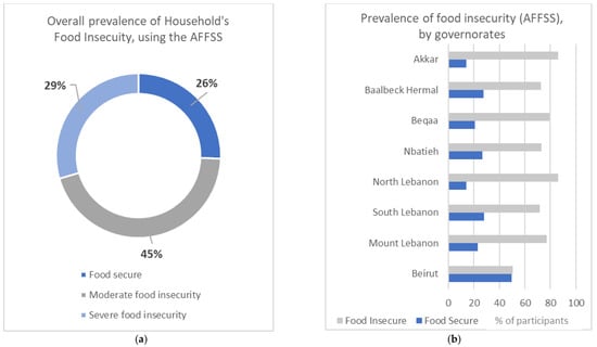 (a) Overall prevalence of household’s food insecurity. (b) Prevalence of household’s food insecurity, by governorate.