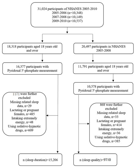 NHANES began to conduct sleep questionnaires in 2005–2006, and the sleep-related items were incomplete in 2009–2010. In addition, the measurement of serum PLP was up to 2019–2010, and the detection method was consistent between 2005 and 2010. Thus, in this study, two cycles of data (NHANES 2005–2006, and 2007–2008) and three cycles of data (NHANES 2005–2006, 2007–2008, and 2009–2010) were selected to explore sleep quality (n = 9710) and sleep duration (n = 15,206), respectively. We excluded participants <18 years old and those who did not have serum PLP data. Participants with extreme energy intake (500 kcal/day for both males and females, >8000 kcal/day for males, and >5000 kcal/day for females), females who were pregnant and lactating, and subjects using sedative-hypnotics were further excluded. Finally, 9710 people were included to study sleep quality and 15,206 were included to study sleep duration. The specific process is shown in Figure 1.