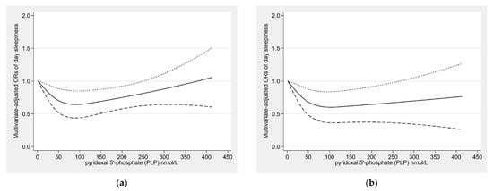 Restricted cubic spline model of the odds ratios (ORs) of day sleepiness with pyridoxal 5′-phosphate (PLP) concentration for the overall population (a) and males (b). The solid line and dashed lines represent the estimated ORs and the 95% confidence intervals.