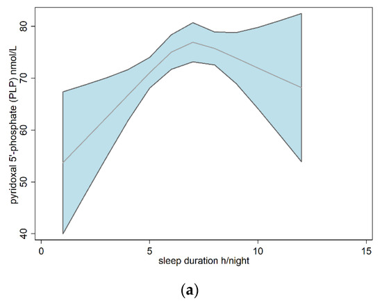 The dose–response relationship between serum PLP concentrations and sleep duration is shown in Figure 3a, presenting an inverted U-shape trend. We found similar relationships for both sexes (Figure 3b,c). Average serum PLP concentrations were highest in both males and females with normal sleep duration (7–<9 h).