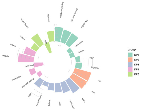 As shown in Figure 1, five mutually exclusive dietary patterns were identified by factor analysis, which together accounted for 45.311% of the total variation. Five DPs could explain 10.58%, 9.31%, 9.18%, 8.75% and 7.49% of the variance, respectively. DP1 was named “animal product and vegetable pattern”, characterized by high factor loadings from meat and poultry, fish and shrimp, vegetables, eggs and legumes. Similarly, the other four DPs were named DP2—condiments pattern (rich in oils and salt), DP3—fruit and junk food pattern (rich in fruits, junk food, nuts, eggs and tubers), DP4—cereals and tubers pattern (rich in cereals, tubers and vegetables and low in junk food) and DP5—beans pattern (rich in legumes, mixed beans and tubers, but low in eggs).