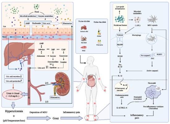 Throughout history, gouty disease has always been strongly associated with abundant foods and immoderate alcohol intake. Gout is even known as the “king’s disease” and symbolized social status in ancient times, as only the upper class could afford to consume wine and meats [1]. Nevertheless, gout currently has been well established as a global health problem and has gained attention due to its increasing incidence rate, multiple metabolic comorbidities, and high premature mortality [2]. Gout is well known as a phlogistic arthritis that is associated with hyperuricemia and elevation of urate in tissues. The increased urate causes the generation of monosodium urate (MSU) crystals, and MSU crystal deposition in and around the first metatarsophalangeal joint, knee, and fingers represents a clinical sign of gout [3]. The clinical symptoms of gout develop in several stages, including asymptomatic hyperuricemia, MSU crystal formation, intermittent gout and chronic gout [4]. Effective gout management mainly relies on the use of therapeutic strategies to control uric acid levels or achieve crystal dissolution. While current clinical principles based on medicinal management for gout have been well implemented [5], dietary modification and lifestyle changes have also been recommended for gout patients, since a suboptimal diet and obesity/diabetes-diseases of affluence contribute significantly to the risk of developing gout [5,6,7], increasing the burden of medical expenses. At present, dietary recommendations have been updated worldwide, and nutritional science for the management of gout has advanced dramatically [8,9]. Historical dietary recommendations for gouty patients tend to emphasize the concepts of “high-” and “low-” levels of the same nutrient, but the role of nutritional elements in gout is difficult to classify by a single beneficent or harmful criterion because problems of systemic metabolism arise when the balance between nutrient intake and consumption is disturbed. This means that although dietary management is considered to be an essential aspect of gout therapeutic strategies [2], a potential dietary mechanism in gout development is out of date or incomprehensive, and a systemic overview of dietary and nutritional factors of gout is needed for well-designed dietary management based on research practice. Moreover, studies have shown that dietary factors mainly focus on food classification, while diet-induced systemic metabolism is rarely mentioned in the progression of gout. It is worthwhile to comprehensively review the mechanistic findings of diets aimed at purine metabolism, urate deposition and gouty inflammation. Our acknowledgment of gout-related nutritional factors can provide a theoretical basis for on-target and comprehensive dietary guidelines for gout patients with different complications or at different stages.