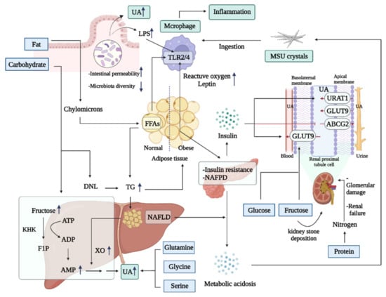 High fat consumption can cause excessive accumulation of triglycerides, inducing increased fat mass and obesity. It has been reported that overweight/obesity was connected with 60% of hyperuricemia cases in a clinical trial of 14,624 adults [70], possibly due to lipid metabolic disorder promoting purine metabolism by elevating XO activity [71]. Hypertrophy and hyperplasia of adipocytes are associated with higher oxygen consumption, which evokes hypoxic damage in other tissues, resulting in the chronic inflammation of obesity [72]. Nonalcoholic fatty liver disease and nonalcoholic fatty pancreatic disease subsequently occur when lipid overload occurs in the liver and pancreatic tissue, causing metabolic dysfunction in both and affecting acid-base balance. Metabolic acidosis further promotes hypercalciuria, low urine pH and hypocitraturia, predisposing patients to MSU crystal deposition and calcium renal stone formation [73]. In response to excessive FFAs circulation, insulin secreted from pancreatic β-cells upregulates the expression of renal urate transporters, including GLUT9 and URAT1, and decreases ABCG2 levels, promoting high SUA levels [18]. Uric acid conversely induces lipid accumulation and insulin resistance (IR), thereby forming a vicious cycle of uric acid and insulin [74].