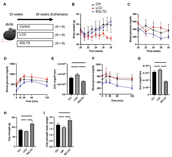 Low-carbohydrate diet (LCD) aggravated glucose impairment and reduced muscle strength, whereas sodium-glucose co-transporter-2 inhibitor (SGLT2i) improved them. (A) Overview of the feeding and euthanasia protocol. (B) Body weight changes. (C) Fasting blood glucose changes. (D,E) Intraperitoneal glucose tolerance test (iPGTT) results and the area under the curve (AUC) of iPGTT. (F,G) Insulin tolerance test (ITT) results and the AUC of ITT. Luseogliflozin improved their impaired glucose tolerance. (H,I) Absolute and relative grip strength. Data are mean ± standard deviation (SD). One-way analysis of variance (ANOVA) was conducted for statistical analysis.