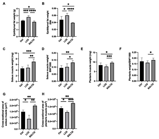 LCD increased visceral fat weight and decreased skeletal muscle, whereas SGLT2i decreased visceral fat weight and increased skeletal muscle. (A,B) Absolute and relative epididymal fat weights. (C,D) Absolute and relative soleus muscle weights. (E,F) Absolute and relative plantaris muscle weights. (G,H) Cross-sectional areas of the soleus and plantaris muscles. Data are mean ± SD. One-way ANOVA was conducted for statistical analysis. * p < 0.05, ** p < 0.01, *** p < 0.001, and **** p < 0.0001.