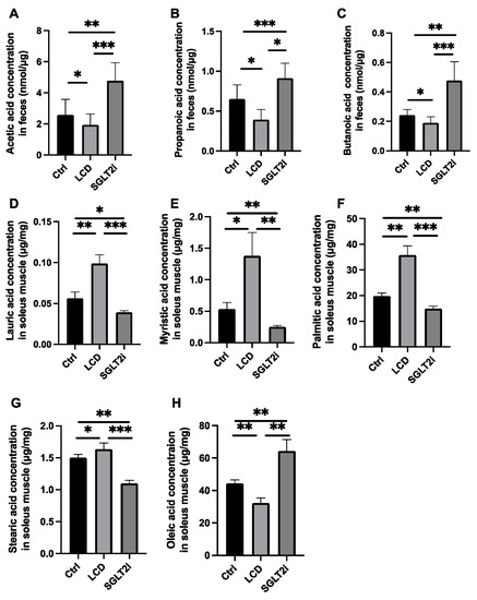 The fecal concentration of short-chain fatty acid and the concentration of saturated fatty acid and unsaturated fatty acids in the soleus muscle. The fecal concentration of (A) acetic acid, (B) propanoic acid, and (C) butanoic acid. The concentrations of (D) lauric acid, (E) myristic acid, (F) palmitic acid, (G) stearic acid, and (H) oleic acid in the soleus muscle. Data are mean ± SD. Statistical analyses were conducted using ANOVA. * p < 0.05, ** p < 0.01, and *** p < 0.001.
