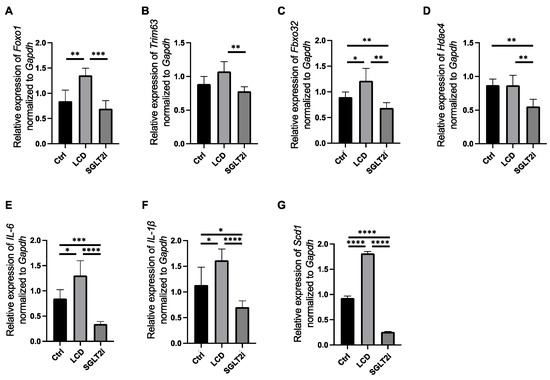 Further, the gene expression levels involved in muscle atrophy, inflammation, and fatty acid synthesis were investigated using RT-PCR. The gene expression levels related to muscle loss, such as Foxo1 and Fbxo32, in the LCD mice, was higher than that in the Ctrl mice. The gene expression levels of Foxo1, Trim63, Fbxo32, and Hdac4 in the SGLT2i group was lower than that in the LCD mice (Figure 5A–D). In addition, the gene expression involved in inflammation, such as Il-6 and Il-1 beta, was higher in the LCD mice than that in the Ctrl and SGLT2i groups (Figure 5E,F). Similarly, the gene expression levels involved in fatty acid synthesis, such as Scd1, in the LCD group was higher than that in the Ctrl and SGLT2i mice (Figure 5G).