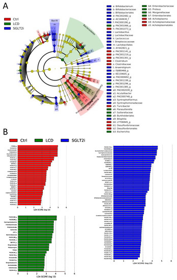 The composition of gut microbiota analyzed using shotgun metagenome analyses. (A) LEfSe was used to identify the taxa with the greatest differences in abundance between the gut microbiota of Ctrl, LCD, and SGLT2i groups (n = 3). Ctrl (Red); LCD (Green); SGLT2i (Blue). The brightness of each dot is proportional to the effect size. Only taxa with a significant LDA threshold value > 2 are demonstrated. (B) LDA scores of gut microbiota of Ctrl (Red), LCD (Green), and SGLT2i (Blue) groups.