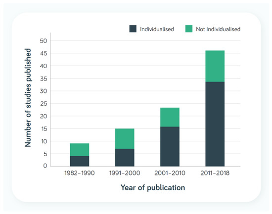 Table 3 shows the number of studies included by Baldwin et al. where the nutrition intervention for DRM in adults was described as individualised or individualisation was not mentioned in the description of the intervention. Figure 2 shows there has been a higher number of studies reporting aspects of individualisation over the last 20 years.