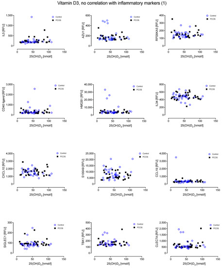 In conclusion, in a non-obese PCOS population matched for age, BMI and insulin resistance, circulating inflammatory proteins and matrix metalloproteinases were not elevated and did not correlate with 25(OH)D3, its epimer 3epi25(OH)D or 1,25(OH)2D3 in either control or PCOS women, indicating that the inflammatory response is absent and the vitamin D-metabolite independent in non-obese non-insulin resistant PCOS.