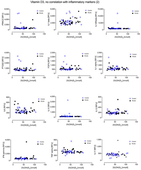 Furthermore, there was no relationship evident between the inflammatory proteins and levels of 25(OH)D3 in either cohort (Figure 2 and Figure 3).