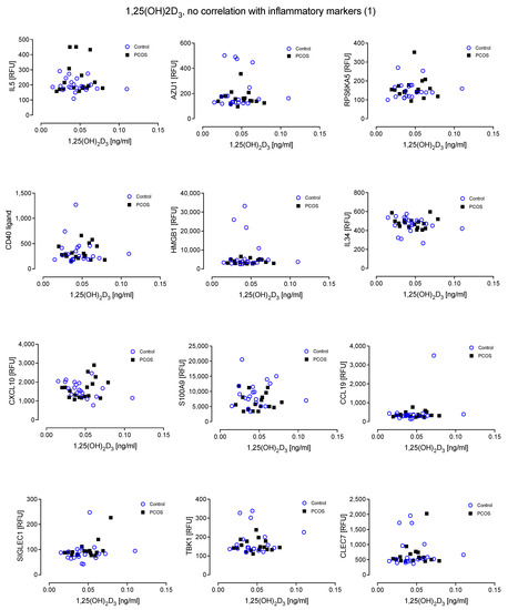 No relationship was found between 1,25(OH)2D3 and the inflammatory markers Interleukin-5 (IL5), Azurocidin (AZU1), Ribosomal protein S6 kinase alpha-5 (RPS6KA5), CD40 ligand (CD40LG), High mobility group protein B1 (HMGB1), Interleukin-34 (IL34), C-X-C motif chemokine 10 (CXCL10), Protein S100-A9 (S100A9), C-C motif chemokine 19 (CCL19), Sialoadhesin (SIGLEC1), Serine/threonine-protein kinase (TBK1) and C-type lectin domain family 7 member A (CLEC7A).