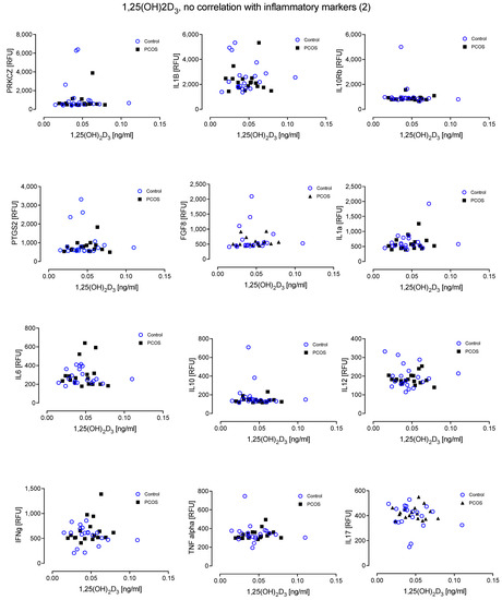 No relationship was found between 1,25(OH)2D3 and the inflammatory markers Protein kinase C zeta type (PRKCZ), Interleukin-1 beta (IL1beta), Interleukin 10 receptor beta subunit (IL10Rbeta), Prostaglandin G/H synthase 2 (PTGS2), Fibroblast growth factor 8 (FGF8), Interleukin-1 alpha (IL1alpha), IL6, IL10, IL12, Interferon gamma (IFN-g), Tumour necrosis factor alpha (TNF-a) and IL17.