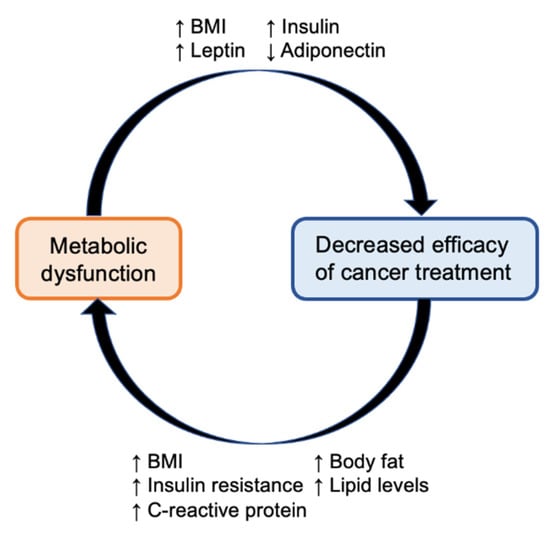 The paradoxical cycle of metabolic perturbation and treatment resistance: metabolic dysfunction, through various factors such as body mass index (BMI), insulin resistance, and altered levels of leptin and adiponectin, limits the efficacy of cancer treatment. Cancer treatments such as chemotherapy can worsen metabolic dysfunction, which in turn further limits treatment efficacy.