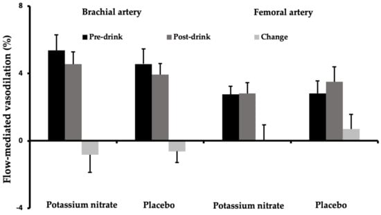 As shown in Figure 1, fasting brachial and femoral FMD responses did not differ between test days (p = 0.10 and p = 0.96, respectively). Moreover, changes in brachial (−0.8% vs. −0.6%, p = 0.86) and femoral (0.0% vs. 0.7%, p = 0.54) artery FMD responses were not significantly different between the nitrate salt and the placebo drink.