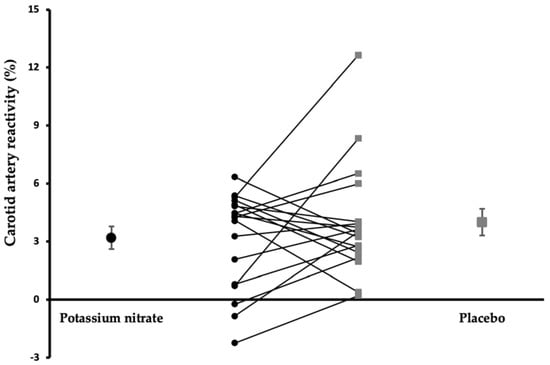 CAR responses to a cold pressure test were assessed as a non-invasive measure of endothelial function of a central elastic artery. These responses are strongly related to CVD risk factors and may also predict future CVD events [,]. Contrary to FMD, mechanisms underlying the CAR are less well understood. The CAR response to a cold pressure test is determined by the balance between vasodilation and vasoconstriction that are caused by the release of catecholamines, such as norepinephrine []. Norepinephrine is known to induce vasodilation via endothelium-dependent effects, whereas it also causes vasoconstriction of smooth muscle cells via effects on the sympathetic nervous system [,]. A broad range of CAR responses can thus be expected, which can either be positive or negative, as compared with FMD values that usually only vary between 2% and 8%. As mentioned before, endothelial function is not uniform across all arteries []. In fact, the carotid artery is a major central elastic artery that has different properties compared with peripheral muscular arteries []. Although the function of both types of arteries is associated with CVD risk, carotid artery function may be more strongly associated with cerebrovascular disease, while the function of muscular arteries may be more strongly related to coronary heart disease []. As a result, the focus should be on both central elastic and peripheral muscular arteries as this will provide a more complete picture of the impact on endothelial function throughout the arterial tree. In line with the FMD results, no effects of inorganic nitrate on CAR responses were observed. However, a significant difference in 4 h baseline carotid artery diameters was found with higher diameters after the potassium nitrate drink as compared with placebo. A greater baseline carotid artery diameter may also predict a higher CVD risk [], but effects should be interpreted with caution as only 4 h carotid artery measurements were performed, and fasting values were not available to calculate changes.
