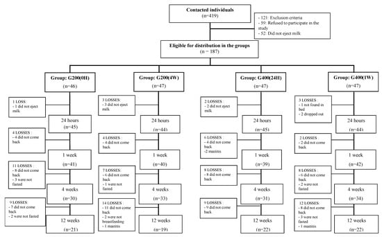 The participants were placed in one of the four study groups immediately after delivery. The participants then met periodically with the research team during the next twelve weeks. A 12-week follow-up time was chosen because the first three or four months of lactation seem to be the period of greatest breast milk nutrient variation. Nutrient levels then seem quite stable after this period until the involution of the mammary gland [,].
