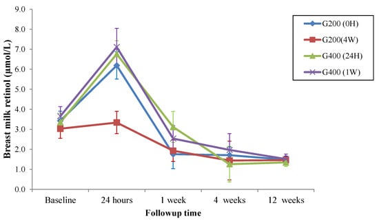 All groups had similar baseline levels of breast milk retinol (p = 0.83). However, retinol level in the colostrum at 24 h was lower in the G200 (4W) group than in the G200 (0H) (p = 0.007); G400 (24H) (p = 0.001); and G400 (1W) (p = 0.006) groups, which remained similar (p = 1.00) at 24 h. All groups had similar breast milk retinol levels at 1 week, 4 weeks, and 12 weeks (p > 0.05) (Figure 2).