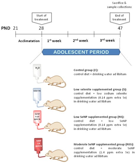 On PND 28, when the adolescent period began, rats with an initial weight of 49.8 ± 3.3 g were randomly assigned to four experimental groups (n = 6/group) according to their treatments (Figure 1): control group (C), rats received control diet and drinking water ad libitum; low-selenite-supplementation group (S), rats received control diet and low sodium selenite supplementation in drinking water ad libitum; low-SeNP-supplementation group (NS), rats were exposed to control diet and low SeNP supplementation in drinking water ad libitum; moderate-SeNP-supplementation group (NSS), rats were given the control diet and moderate SeNP supplementation in drinking water ad libitum. This latter group was studied to control the potential adverse effects of SeNP administration.