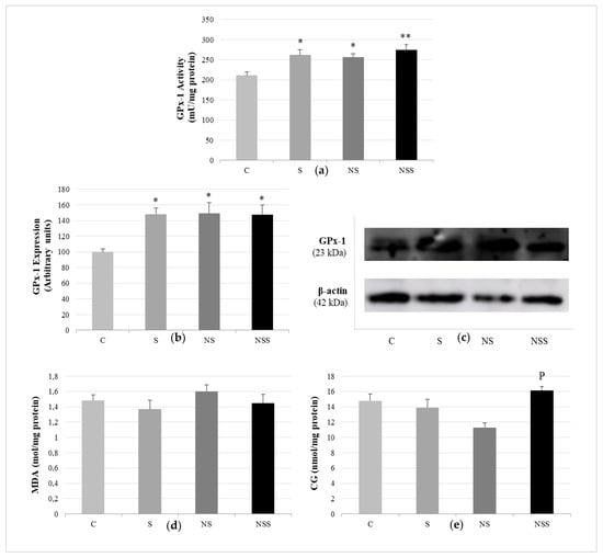 Figure 4 displays the data relative to oxidative balance in WAT, showing that the three supplementation groups had significantly higher GPx1 expression and GPx activity than C rats. There were no differences in these parameters among the supplementation groups; however, NSS rats presented more significant GPx activity than C ones. The oxidative lipid and protein damage was similar among the four studied groups, but NSS rats had higher levels of CGs than NS ones.