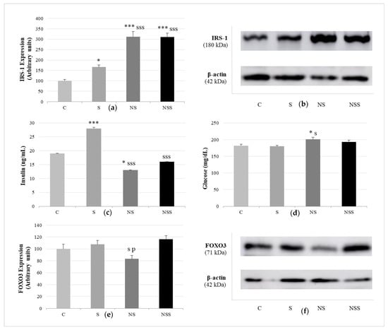 Relative to insulin function, Figure 5 shows that insulin serum levels were significantly increased in S rats vs. the rest of the groups and decreased in NS rats vs. C ones. Glucose serum values were only enlarged in NS rats with respect to C and S animals. The expression of WAT IRS-1 was increased in the three supplementation groups with respect to the C one; however, this increase was greater in NS and NSS rats, without differences among them. The marker of lipogenesis via autophagy, FOXO3a, in WAT was reduced after low exposure to SeNP compared with the expression found in S and NSS animals.