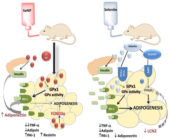 For the first time, in an experimental in vivo study, it was demonstrated that the form of oral low Se administration, dissolved sodium selenite or SeNPs in water, differently affected WAT homeostasis and function. Selenite supplementation during adolescence favored adipogenesis by promoting insulin secretion and sensitivity leading to a general anabolism, without obesity or inflammation, in which the adipokine LCN2 played a pivotal role. By contrast, SeNP supplementation during adolescence impaired adipogenesis and fat deposits in WAT. These effects were due in part to lower insulin secretion, which could not properly activate the insulin signaling pathway in WAT, despite the high amount of IRS-1 that was expressed and the adiponectin amount secreted. Moreover, SeNPs have a well-known anti-inflammatory action in WAT, in part by decreasing the lipogenic and pro-inflammatory FOXO3a expression. Therefore, low selenite may be considered as a pro-adipogenic therapy, while low SeNP administration prevented adipocyte differentiation. These findings could provide important novel dietary approaches to prevent obesity and/or anorexia nervosa during adolescence, two important metabolic disturbances that are dangerously increasing in the adolescent population.