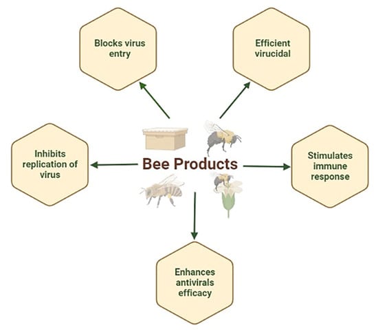Honey is an oxidizing agent with anti-inflammatory, antiproliferative, immunomodulatory, proapoptotic, antimetastatic, and antimicrobial properties [10,11,12]. Bee venom acts as apitoxin or biotoxin prepared by bee glands and secreted in the abdominal cavity of bees. It was also found to be effective in the treatment of different types of cancers, with effects such as cancer cell proliferation inhibition, induction of apoptosis, cytotoxicity, and necrosis [13]. Propolis, commonly known as bee glue, is made up of pollen, essential oils, waxes, resins, and various organic substances, including minerals, amino acids, flavonoids, polyphenols, ethanol, and different vitamins. It actively acts against hive-invading pathogenic microorganisms, including viruses and bacteria [14,15]. Finally, bee products are well known for their antiviral properties (Figure 1), which can surpass the standard available drugs in different cases. Indeed, propolis and honey have been observed to induce significant antiviral activities against different pathogenic mammalian viruses, including herpesviruses [16], influenza viruses [17], HIV, respiratory syncytial virus (RSV) [18], human T-cell leukemia virus type 1 (HLTV-1) [19], dengue virus (DENV) [20], Newcastle disease virus (NDV) [21], and poliovirus (PV). In addition, bee pollen and bee bread were efficacious antivirals against herpes virus types 1 and 2 (HSV-1 and HSV-2) in an in vitro study [22]. They were also reasonably effective against three influenza virus strains (H1N1, H3N2, and H5N1) [23]. Several clinical studies have suggested their practical use in place of antiviral drugs. Propolis can also be used to effectively inhibit HSV-1 and HSV-2 replication. A significant quantitative reduction in the viral copies of HSV-1 and HSV-2 confirmed the antiviral activity of propolis [24]. Vynograd et al. (2000) [25] investigated the efficacy of Canadian propolis ointment compared with acyclovir and placebo ointments in managing the herpes simplex virus. The healing capacity and the antimicrobial activity against the vaginal microflora were significantly enhanced by Canadian propolis as compared to acyclovir or placebo. Its antiviral activity was synergistically enhanced in combination with acyclovir [26]. Recently, bee products, more specifically propolis and honey, have been effectively clinically tested against SARS-CoV-2 due to their potential antiviral properties [27].