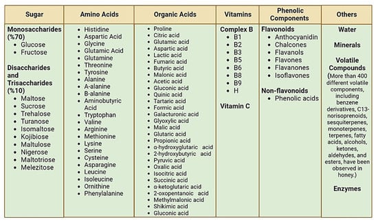 Honey’s general composition is represented by different simple sugars and water. Its minor components, such as proteins and amino acids, enzymes, organic acids, flavonoids, volatile compounds, vitamins, and minerals, differentiate honeys originating from different botanical sources. Honey characteristics such as aroma, color, and flavor directly depend upon factors such as the honeybee species, floral source, climatic conditions, processing methods, packaging, and storage conditions [36]. Sugars are known as the major constituents of honey, ranging from 70–80%, containing about 70% monosaccharides (glucose and fructose) and about 10% di- and trisaccharides (maltose, sucrose, trehalose, turanose, isomaltose, kojibiose, maltulose, nigerose, maltotriose, erlose, and melezitose) [37,38]. In addition, proteins are also minor constituents of honey, including different enzymes and free amino acids. Among amino acids, proline is found in the highest amounts in honey. Furthermore, histidine, aspartic acid, glycine, glutamic acid, glutamine, threonine, tyrosine, alanine, a-alanine, b-alanine, aminobutyric acid, tryptophan, threonine, valine, arginine, methionine, lysine, serine, cysteine, asparagine, leucine, isoleucine, ornithine, and phenylalanine are also present in honey [39].