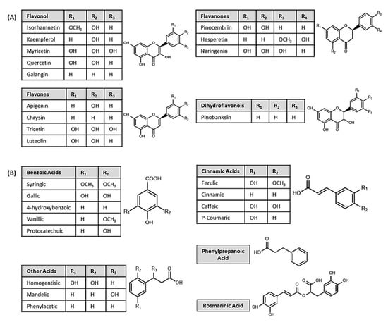 Chemical structures of some important phenolic components in honey; (A) flavonoids and (B) phenolic acids.