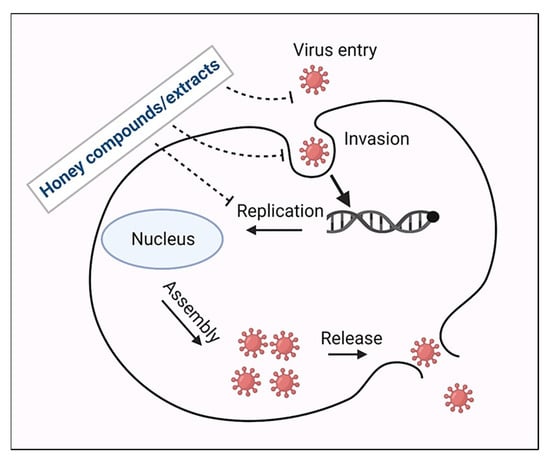 Viral infections are considered the most prevalent and deadly infections among all other microbial infections because many viruses remain infectious for a long period in dry mucous [47]. As viruses replicate in the host cells, their destruction also means the destruction of host cells, and vaccination is the best method to prevent viral infections [48]. Several investigations have determined the therapeutic impact of honey and its bioactive compounds against many viral infections. They may protect against the respiratory syncytial virus, varicella-zoster virus (VZV), influenza, herpes simplex viruses, immunodeficiency virus, rubella virus, AIDS, rhinoconjunctivitis, gingivostomatitis, viral hepatitis, rabies, and SARS-CoV-2 (Table 1) [49,50,51,52,53,54,55,56,57,58,59]. The exact mechanism of action of honey and its bioactive compounds is immense and still unknown. Bioactive components such as quercetin, chrysin, kaempferol, etc., may provide antiviral activity by preventing the entry, entrapment, and replication of viruses (Figure 4).