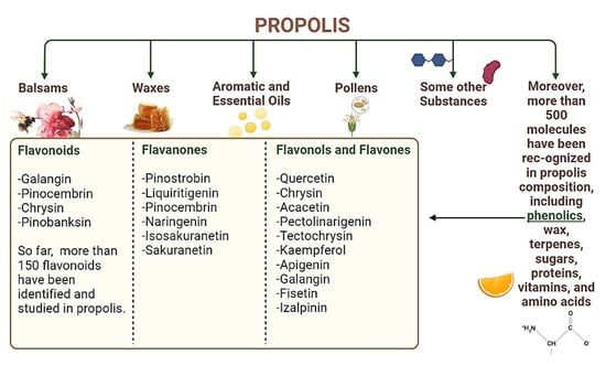 The composition of propolis (Figure 6) varies depending upon the floral source, collection time, and genetic background of bees [104]. Its content typically includes plant resins and balsams (55%), waxes (30%), aromatic and essential oils (10%), pollens (5%), and some other substances (5%) [105]. Moreover, more than 500 molecules have been recognized in propolis composition, including phenolics, wax, terpenes, sugars, proteins, vitamins, and amino acids [106]. The phenolic components comprise high amounts and different types of chemical constituents, including phenolic acids, flavonoids, aldehydes, coumarins, esters, simple phenols, and lignans. Flavonoids are distinct components of propolis, such as galangin, pinocembrin, chrysin, and pinobanksin. So far, more than 150 flavonoids have been identified and studied in propolis [105].