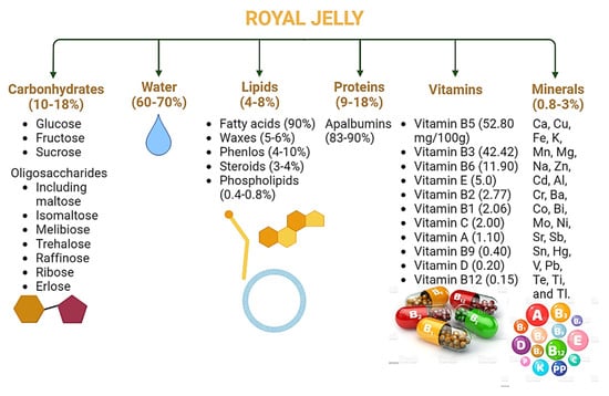 The lipid components are the unique feature of RJ composition. About 90% of lipids are composed of fatty acids, and the remaining components include waxes (5–6%), phenols (4–10%), steroids (3–4%), and phospholipids (0.4–0.8%) [143,149]. Several vitamins (water-soluble) have been identified in RJ composition. Vitamin B5 (52.80 mg/100 g) [150] is the chief vitamin component of the composition. Other vitamins found in its composition include vitamins B3, B6, E, B2, B1, C, A, B9, D, and B12 with particular amounts of 42.42, 11.90, 5.00, 2.77, 2.06, 2.00, 1.10, 0.40, 0.2, and 0.15 mg/100 g, respectively [151].