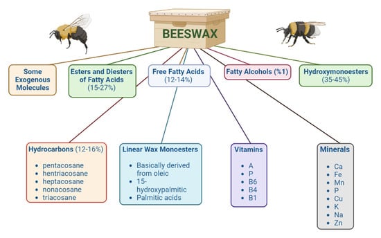 Beeswax (Figure 8) contains about 300 different components, such as 12–16% hydrocarbons (pentacosane, hentriacosane, heptacosane, nonacosane, and triacosane), 35–45% hydroxymonoesters and linear wax monoesters (basically derived from oleic, 15-hydroxypalmitic, and palmitic acids), 12–14% free fatty acids, 1% fatty alcohols, 15–27% esters and diesters of fatty acids, and some exogenous molecules (residues of pollen and propolis) [156]. Its composition may vary depending upon the different families and bee breeds [157]. Minerals (including Ca, Fe, Mn, P, Cu, K, Na, and Zn) and vitamins (including A, P, B6, B4, and B1) are also beeswax components. Beeswax is also used as an additive in the cosmetic, pharmaceutical, and food industries [158]. Moreover, it has also shown an antimicrobial effect against bacteria (Staphylococcus aureus and Salmonella enterica) and fungi (Aspergillus niger and Candida albicans) [159].
