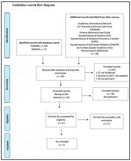 Vegetarian diets and different auxological development and/or growth. Flow diagram of the guidelines search. GL: Guide-Line.