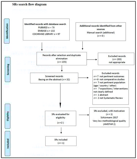 This SR included the following studies and documents: a multidisciplinary and evidence-based document that makes graded recommendations relevant to the question [] (Figure 1), an SR of low methodological quality [] (Figure 2) from which the only relevant study of moderate quality was selected []. In addition, a cross-sectional study of moderate quality was included [] (Figure 3).