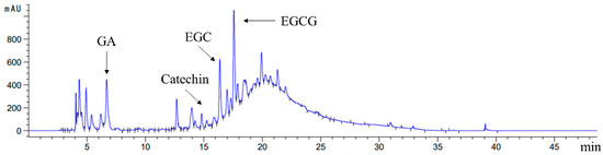 As shown in Table 1, 120.13 ± 2.88 mg GAE/g FW of free polyphenol and 125.71 ± 6.06 mg CE/g FW of free flavonoid were observed in Rhodiola rosea, whereas the contents of bound polyphenol and bound flavonoid were 2.58 ± 0.22 mg GAE/g FW and 3.28 ± 0.24 mg CE/g FW, respectively. In the case of the low contents of bound polyphenol, RFE in Rhodiola rosea was considered as the main research object. Table 1 and Figure 1 show that the main ingredient in RFE was EGCG (722.10 ± 54.26 mg/100 g FW), which was followed by gallic acid (319.17 ± 41.18 mg/100 g FW). The EGC ranked third with the content of 267.04 ± 16.09 mg/100 g FW, followed by catechin (35.93 ± 7.39 mg/100 g FW).