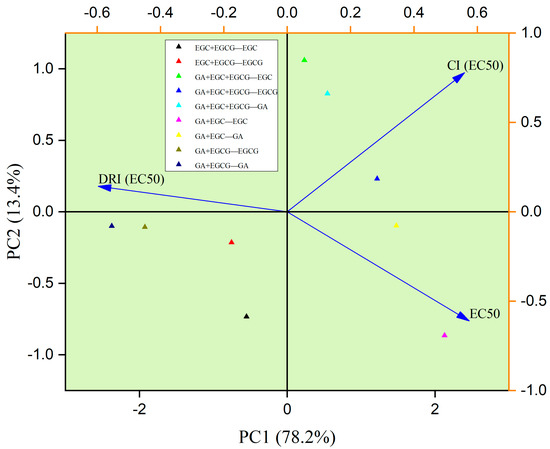 Principal component analysis (PCA) among the phenolic monomer combination groups was performed and is shown in Figure 5. Overall, 91.6% of variation among tested samples was attributed to PC1 (78.2%) and PC2 (13.4%). PC1 separation was mostly caused by DRI (EC50), CI (EC50), EC50, whereas PC2 was separated owing to CI (EC50) and EC50. Moreover, two monomers (GA and EGCG) in the GA + EGCG group possessed comparatively lower EC50 values, suggesting the relatively weaker antiproliferative activities of those groups. In addition, the GA + EGCG group showed comparatively larger DRI and smaller CI, suggesting the extraordinary synergistic effects on inhibiting the growth of HepG2 cells. Meanwhile, GA in the GA + EGC group and EGCG in the GA + EGC + EGCG group were close at PC1 levels, which had relatively larger CI and lower DRI values. This phenomenon implied the fact that they were similar in some features, such as poor synergistic effects and inhibitory effects.