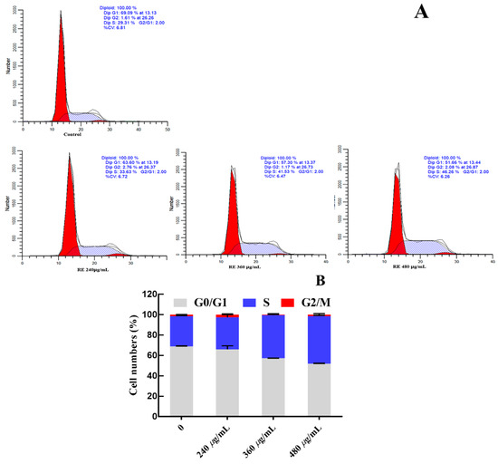 G0/G1 phase, S phase and G2/M phase constitute the complete cell cycle. Different DNA contents exist in different cell stages, thus the potential antiproliferative mechanism can be evaluated by comparing the change in DNA contents among various groups. The concentrations of RFE (240 μg/mL, 360 μg/mL and 480 μg/mL) were selected based on the EC50 values of RFE against the proliferation of HepG2 cells (Table 5). After supplementing with RFE, 29.76–46.75% of HepG2 cells were dose-dependently arrested in the S phase (Figure 6), confirming the inhibitory effect of RFE on the proliferation of HepG2 cells. After intervention with RFE, a decrease from 68.72% to 51.90% of HepG2 cells in the G1 phase could be observed, while the proportion of cells in the G2 phase fluctuated up and down slightly.