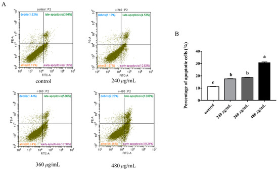 The effect of RFE on cell apoptosis was evaluated and is depicted in Figure 7. The apoptosis rate of HepG2 cells was dose-dependently enhanced after exposure to RFE. An increase from 11% to 31.32% in the proportion of apoptotic cells could be found with the increased doses of RFE. After administration with 240 and 360 μg/mL RFE, most HepG2 cells exhibited early apoptosis, where the early apoptosis rate of cells was more than twice the late apoptosis rate. However, the percentages of early and late apoptotic cells (12.08% and 19.24%, respectively) were similar to each other when the concentration of RFE was 480 μg/mL.