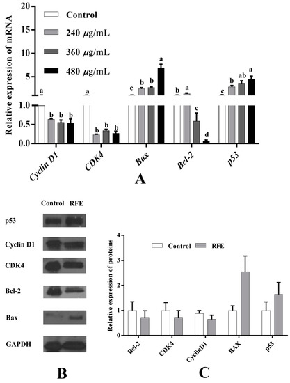 Effect of RFE on the mRNA expression of proliferation-related genes in HepG2 cells detected by RT-qPCR (A); protein bands of p53, cyclin D1, CDK4, Bcl-2, Bax and GAPDH (B); and the relative expression of proteins in control and RFE groups (C). Bars with different letters differ significantly at p < 0.05.