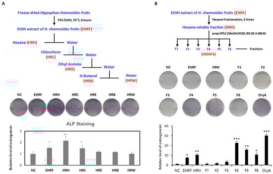 Evaluation of the effects of each fraction from the EtOH extract of H. rhamnoides fruits on osteogenesis. (A) Stimulatory effect of each solvent soluble fractions, derived from the process above, on the osteogenic differentiation of mesenchymal stem cells (MSCs) into osteoblasts. Fully differentiated C3H10T1/2 cells were stained with alkaline phosphatase (ALP) after 9 days of osteogenic differentiation with 50 μg/mL of each isolated extract. The relative levels were calculated by setting the negative control (NC) to 1. (B) Stimulatory effects of each extract, derived from the process above, on osteogenic differentiation of MSCs toward osteoblasts. Fully differentiated C3H10T1/2 cells were stained with ALP after 9 days of osteogenic differentiation with 50 μg/mL of each isolated extract. The relative levels were calculated by setting the negative control (NC) to 1. Oryzativol A (5 μM, 3.64 μg/mL), which has been proven to be effective in osteogenesis, was used as a positive control and marked as OryA. *, **, and *** indicate difference from nontreated control. * denotes 0.01 ≤ p ≤ 0.05; ** denotes 0.001 ≤ p < 0.01; and *** denotes p < 0.001.