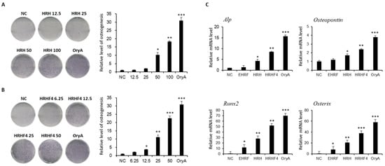 The C3H10T1/2 cell line, derived from mouse embryonic fibroblasts, was cultured in Dulbecco’s modified Eagle’s medium with 10% heat-inactivated fetal bovine serum, 100 μg streptomycin, and 100 U penicillin at 37 °C in an incubator with 5% CO2. To measure osteoblastic differentiation, C3H10T1/2 cells were seeded at a density of 5 × 105 cells/well in 6-well plates and treated with 10 mM β-glycerophosphate and 50 μg/mL ascorbic acid for 7–9 days. Oryzativol A (5 μM, 3.64 μg/mL), which has been proven to be effective in osteogenesis, was used as a positive control for osteogenic differentiation of the C3H10T1/2 cells [].
