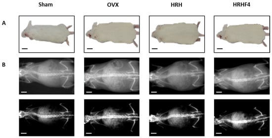 Representative images of each mouse group at the end of animal testing. (A) Whole body images of each mouse group. (B) whole body DEXA images of each mouse group. OVX, bilateral ovariectomy; HRH, Hexane-soluble fraction from ethanol extract of H. rhamnoides fruits; HRHF4, Hexane-soluble fraction number 4 from ethanol extract of H. rhamnoides fruits; DEXA, dual-energy X-ray absorptionmetry. Scale bar, 20 mm.