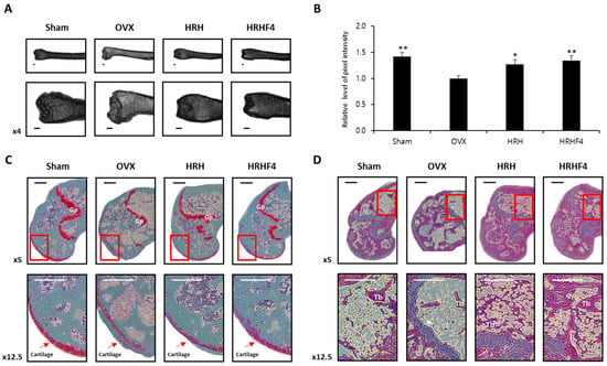 To analyze the breakdown of bone structure due to osteoporosis progression, the left femur of each mouse was isolated and stained with safranin O (Figure 4C) or hematoxylin and eosin (Figure 4D). In contrast to the sham control, cartilage on the femur of OVX animals was damaged and seldom remained. Moreover, the hematopoietic tissue was significantly decreased in the OVX group compared with that observed in the sham group. In the OVX groups, the trabecular bone was thin and the network structure was severely disrupted with expanded spaces, in contrast to the trabecular bone in the sham group, which exhibited a regularly arranged pattern with a thick and dense network. In addition, the number of trabeculae was significantly reduced in the OVX animals. However, in the HRH and HRHF4 ingestion groups, uptake of active fractions improved cartilage damage and suppressed disruption of the trabecular bone structure. The results of the histological profiles showed that the active fractions protected the trabecular cartilage and bone structure in osteoporosis-induced animals.
