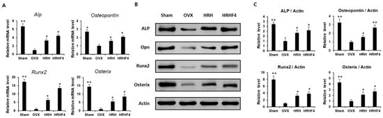 Both tibiae from each mouse were separated and pulverized after sacrifice. mRNA and protein were extracted from the separated tissues to analyze the gene expression related to osteogenesis. The amount of mRNA expression was analyzed by real-time PCR (Figure 5A), and the protein expression was analyzed by Western blotting (Figure 5B). The band of each protein obtained through Western blotting was quantified using Image J (Java) software (Figure 5C). The expression of representative osteogenic biomarkers, including ALP, Osteopontin, Runx2, and Osterix, was significantly reduced in the tibia obtained from mice in the OVX group. However, the HRH and HRHF4 treated groups significantly recovered (* p < 0.05) the expression of the four types of osteogenic mRNAs. The groups administered the active fraction also significantly recovered the expression of the four representative types of osteogenic proteins. In the HRH group, the mRNA expression of ALP—a hallmark of the osteoblast phenotype—was increased 3.3-fold compared to that in the OVX-control group, and the expression of ALP protein was increased 1.8-fold. In the HRHF4-uptake group, the expression of ALP mRNA increased 4.4-fold compared to that in the OVX-control group, and the expression of ALP protein increased 2.1-fold. The mRNA expression of Runx2, an osteogenic commitment marker, increased by 6.4 times and 13.5 times that in the HRH and HRHP4-uptake groups, respectively. The protein expression of Osteopontin increased by 1.6 times and 2.7 times in the HRH and HRHF4-uptake groups, respectively (** p < 0.01). In particular, HRHF4 increased Osterix gene expression and protein expression by 8.5-fold and 2.7-fold, respectively. Based on the above results, the expression levels of osteogenic mRNAs and proteins in the mouse tibia were significantly recovered through the ingestion of the active fractions after osteoporosis was induced. This can be interpreted as the active fractions activating osteogenic gene expression in osteoporosis-induced bone, resulting in active bone metabolism, as in normal animals.