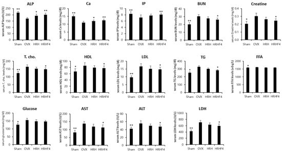 Significant reductions in serum ALP, calcium (Ca), and phosphate (IP) levels and significant increases in serum total cholesterol (T. cho), high density lipoprotein cholesterol (HDL), low density lipoprotein cholesterol (LDL), triglyceride (TG), free fatty acid (FFA), and glucose levels were observed in the OVX control group compared with those in the sham control group, indicating that osteoporosis was induced normally through ovarian resection surgery (Figure 6). Significant increases in serum blood urea nitrogen (BUN), creatinine, aminotransferase (AST), alanine aminotransferase (ALT), and lactate dehydrogenase (LDH) were observed in the OVX control group compared with that in the sham control group, indicating that diseases of the liver and kidneys occurred through the induction of osteoporosis. However, HRH and HRHF4 intake groups showed significant effects on the recovery of the serum ALP levels, which decreased by 27.9% (** p < 0.01) due to osteoporosis induction, by 13.2% (* p < 0.05) and 18.1% (** p < 0.01), respectively. Serum calcium levels decreased by as much as 36.2% (** p < 0.01) and recovered by 8.5% (* p < 0.05) and 13.1% (** p < 0.01) in the HRH and HRHF4 intake groups, respectively. The increased level of serum calcium according to HRH and HRHF4 intake was within the normal range of serum calcium in rodents. The IP level, which was 16.4% (** p < 0.01) after ovarian resection, also significantly recovered by 8.8% (** p < 0.01) and 13.4% (** p < 0.01) after ingestion of HRH and HRHF4, respectively. In addition, it was identified that various serum cholesterol and lipid-related levels that rapidly increased after 12 weeks of osteoporosis induction were significantly lower in the active fraction intake group. In particular, in the HRHF4 intake group, serum T. cho, TG, HDL, and LDL levels were significantly reduced by 9.6% (* p < 0.05), 13.7% (* p < 0.05), 9.1% (* p < 0.05), and 11.5% (* p < 0.05), respectively. When the active fractions were ingested, the levels of serum BUN, creatine, AST, ALT, and LDH were also significantly reduced, showing a possibility of the treatment of diseases in organs caused by osteoporosis. Based on the above serum biochemical analysis results, the administration of active fractions increased the serum levels of bone health-related biomarkers, which were decreased by osteoporosis, and reduced the serum levels of obesity and inflammation-related biomarkers, which were increased by osteoporosis.