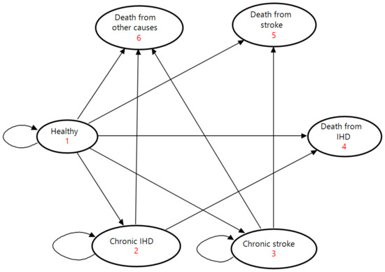 State-transition diagram of the Markov model. Ovals represent the six health states. Direct arrows represent directions of transitions of the cohort between health states. Circular arrows indicate the cohort remaining in each health state. Each arrow has a transition probability. IHD, ischemic heart disease.