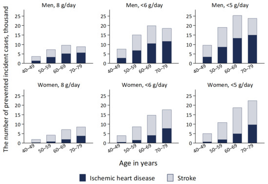 The cumulative total number of averted deaths in the whole cohort was projected to be 12,524 (1.1%; 7990 for IHD and 4534 for stroke) for 8 grams per day, 25,964 (2.3%; 16,593 for IHD and 9371 for stroke) for <6 grams per day, and 32,979 (2.9%; 21,097 for IHD and 11,882 for stroke) for <5 grams per day. Relative reductions of deaths from both IHD and stroke under the salt targets of 8, <6, and <5 grams per day were larger in men at 1.2%, 2.4%, and 3.1%, respectively, than in women at 1.0%, 2.1%, and 2.6%, respectively.