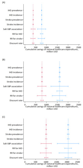 Results of the one-way sensitivity analyses of key input parameters on projected cumulative savings of national healthcare expenditures for IHD and stroke by reducing mean dietary salt intake to 8 g/day (A), <6 g/day (B), and <5 g/day (C) between the years 2019 and 2029 in a closed cohort of population aged 40–79 years in 2019. Blue, men; red, women. Range plots with spikes indicate uncertainty ranges. Dashed lines indicate expected values. IHD, ischemic heart disease; RR, relative risk, SBP: systolic blood pressure.